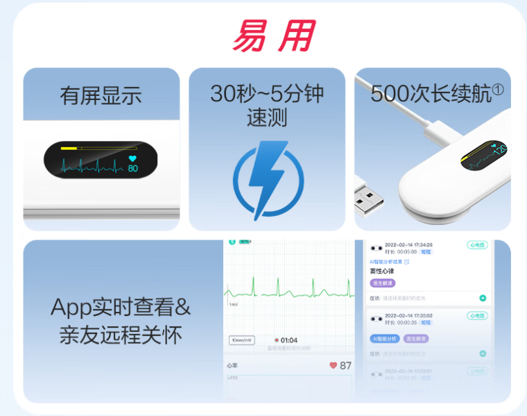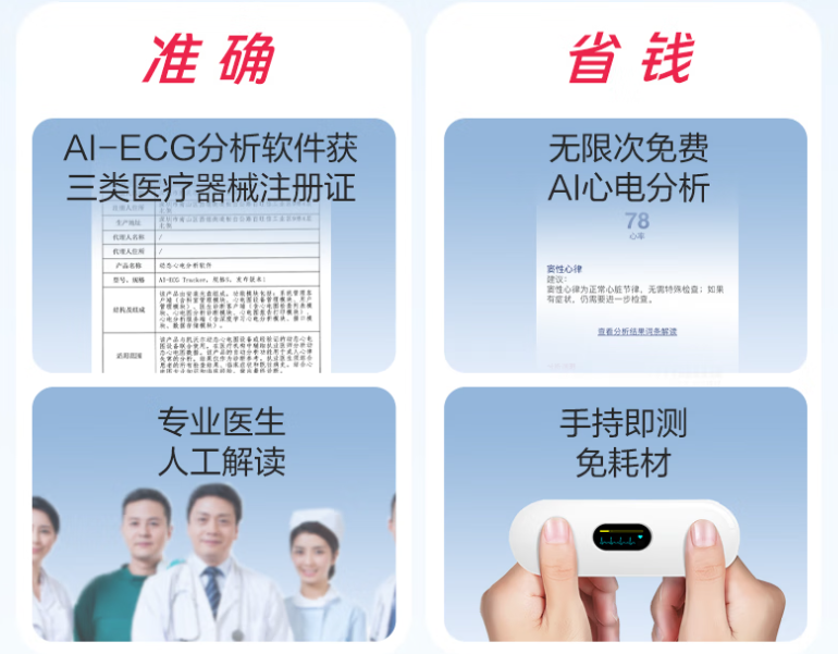 测完数据,蓝牙上传数据到乐普健康App,速出AI分析报告无需专业医学知识,在家也能看得懂 准确率高达99.97%AI-ECG心电分析 全球仅乐普AI-ECG分析软件获得三大认证 一次绑定设备,后续无需反复操作App功能全面,一键导出报告,方便就医咨询