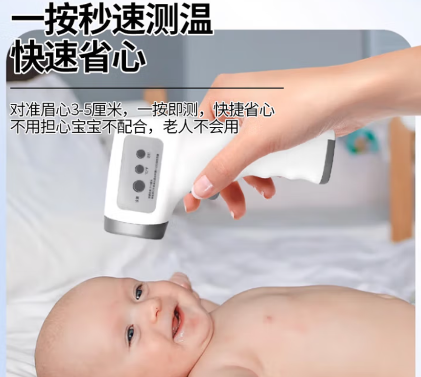 灵敏精密红外探头准确测温 采用高灵敏传感器,分辨力达到0.1℃ |可根据LED显示屏的颜色轻松判断体温是否正常智能变化屏幕颜色一目了然(带蜂鸣提醒) 对准眉心3-5厘米,一按即测,快捷省心不再担心宝宝不配合,老人不会用