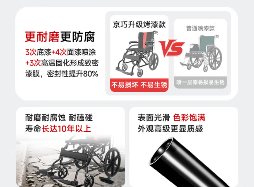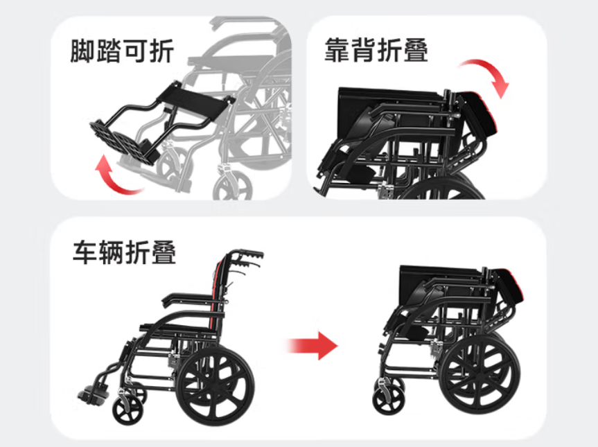 扶手可掀,方便使用人使用 腿部调节,方便折叠收纳的时候体积更小,易携带 在原漆基础上烤漆处理,美观更防腐 可掀扶手一键开启3秒完成上下轮椅 上下轮椅更方便 护理人员更省力 脚踏可折 靠背可折折叠后体积小易携带