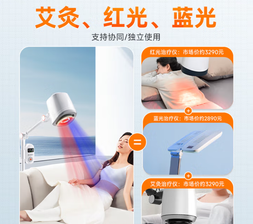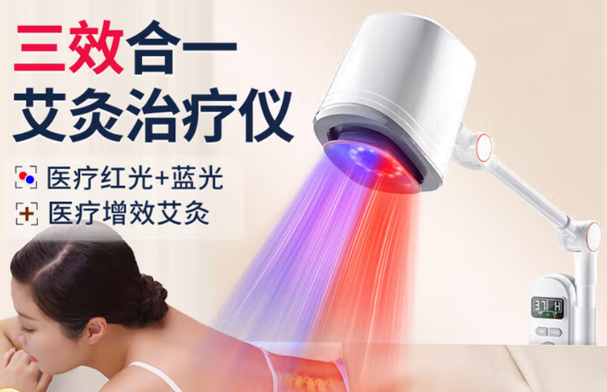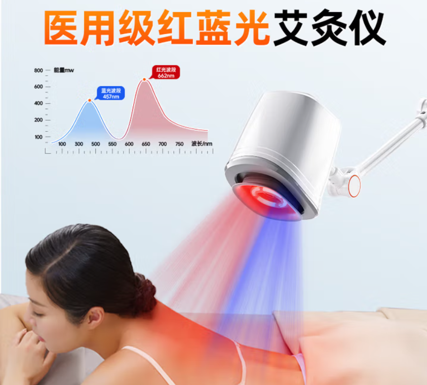 发热模块加灸材,对人体产生温热作用施灸于人体穴位。 艾灸、红光、蓝光支持协同/独立使用 红蓝光助力艾灸艾效足 灸感深 传承古法中医艾灸技术,利用医用红蓝光源的作用机理与人体组织发生光热作用、光化作用m